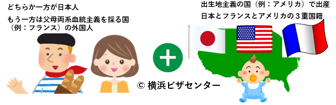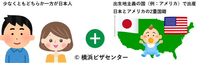 いづれかが日本国籍を持つ父母から出生地主義を採る国の国内で出生した子は、日本国籍と出生地国の国籍を同時に取得して二重国籍者となります。