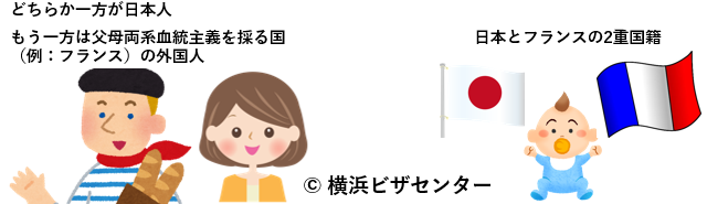 父母のいづれか一方が日本人、他方が外国人である場合において、その外国人が父母両系血統主義を採る国の国民であるときは、その子は日本国籍ともう一方の外国国籍を同時に取得して二重国籍者となります。
