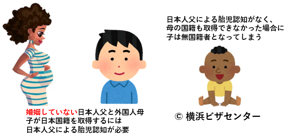 よって、婚姻していない日本人父と外国籍母との間に生まれた子については、父から※胎児認知を受けていない限り、出生によった日本国籍は取得できないので、母の外国籍を取得できない場合は無国籍者となります。